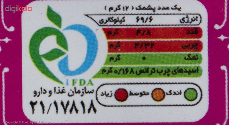 یک عدد پشمک (12 گرم): - انرژی:69.6 کیلوکالری - چربی:4.32 گرم - قند:4.8 گرم - فاقد نمک - اسیدهای چرب ترانس: 0.168 گرم