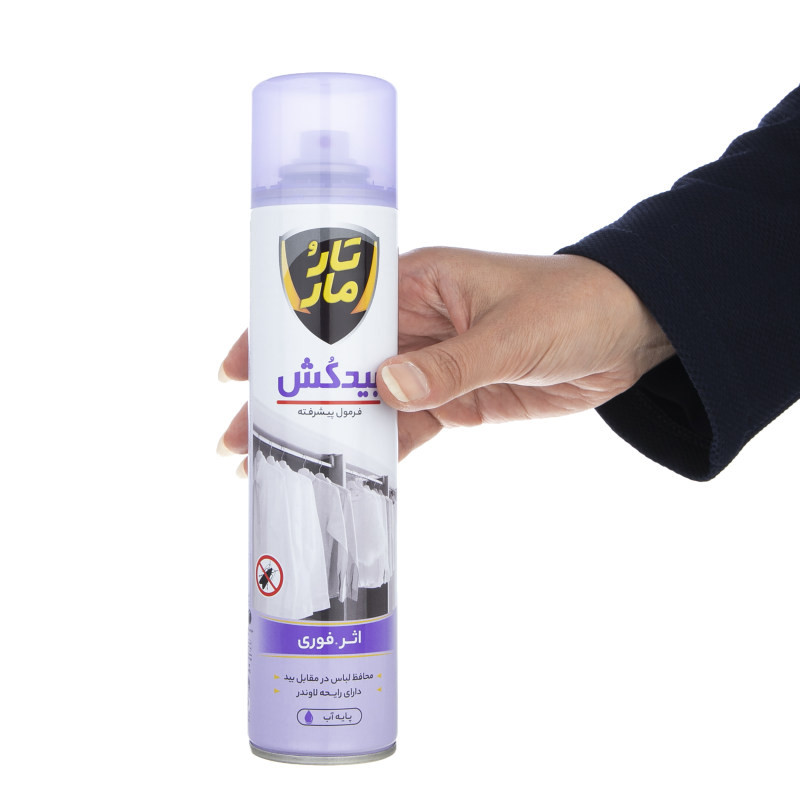 اسپری بیدکش تارومار، اسپری با پایه آب می باشد که به سرعت بیدهای لباس را از بین می برد. این اسپری با فرمول پیشرفته مناسب برای استفاده بر روی بیدهای لباس و یا اسپری کردن در کل اتاق به منظور حفاظت از لباس ها و پارچه ها از آسیب بیدهای لباس می باشد.نحوه مصرف به این صورت است که برای کمدها و کشوها آن ها را خالی کنید قبل از استفاده اسپری را خوب تکان دهید و سپس به مدت 5 تا 10 ثانیه به هر متر مربع از سطح اسپری کنید. قبل از قراردادن مجدد لباس اطمینان حاصل شود که سطح خشک شده باشد.برای فضای اتاق درها و پنجره ها رو ببندید و 3 بار (هر بار به مدت 5 ثانیه) برای یک اتاق با اندازه متوسط(30 متر مکعب) اسپری کنید و 10 دقیقه اتاق را ترک کنید