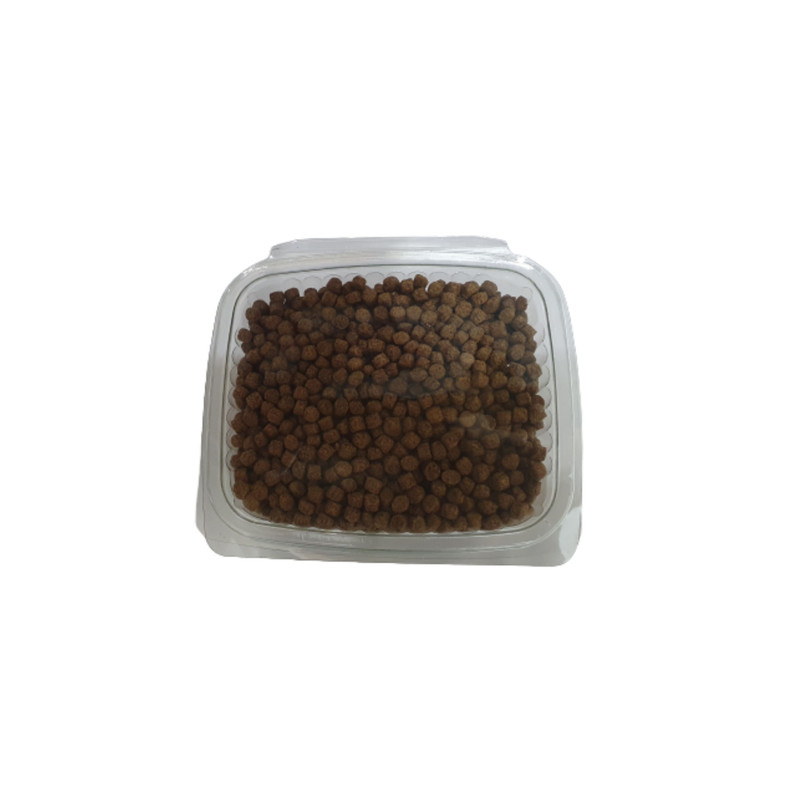 سایز دانه ها 0.5 در 0.5 میباشد. این غذا به صورت رو آبی و شناور میباشد.