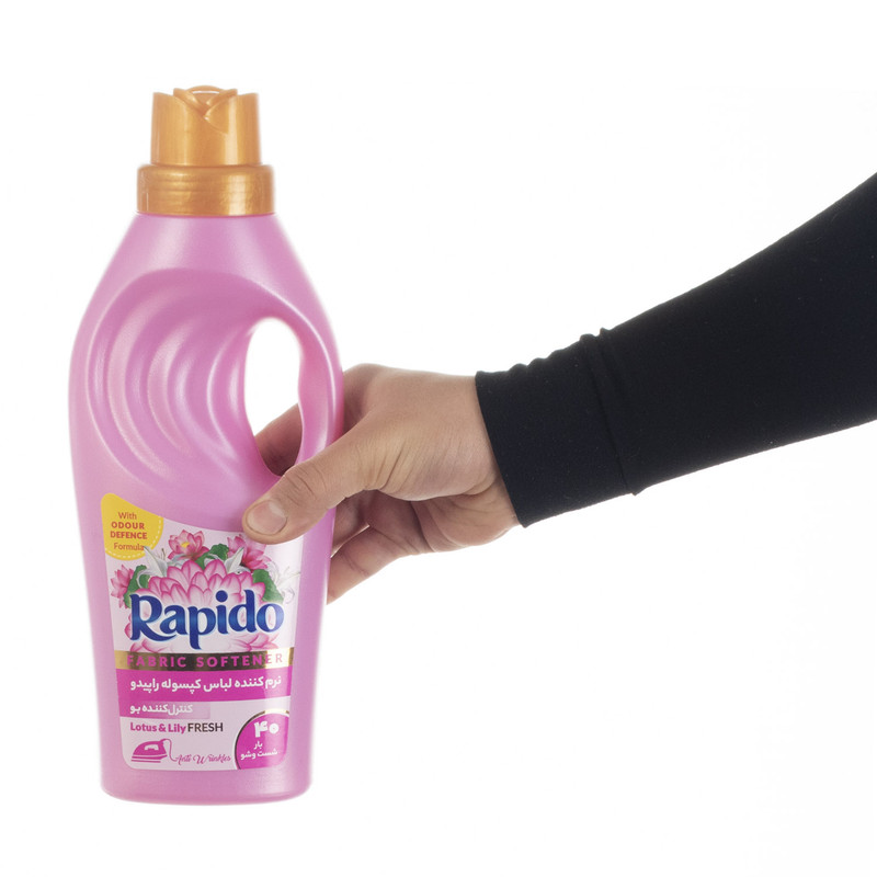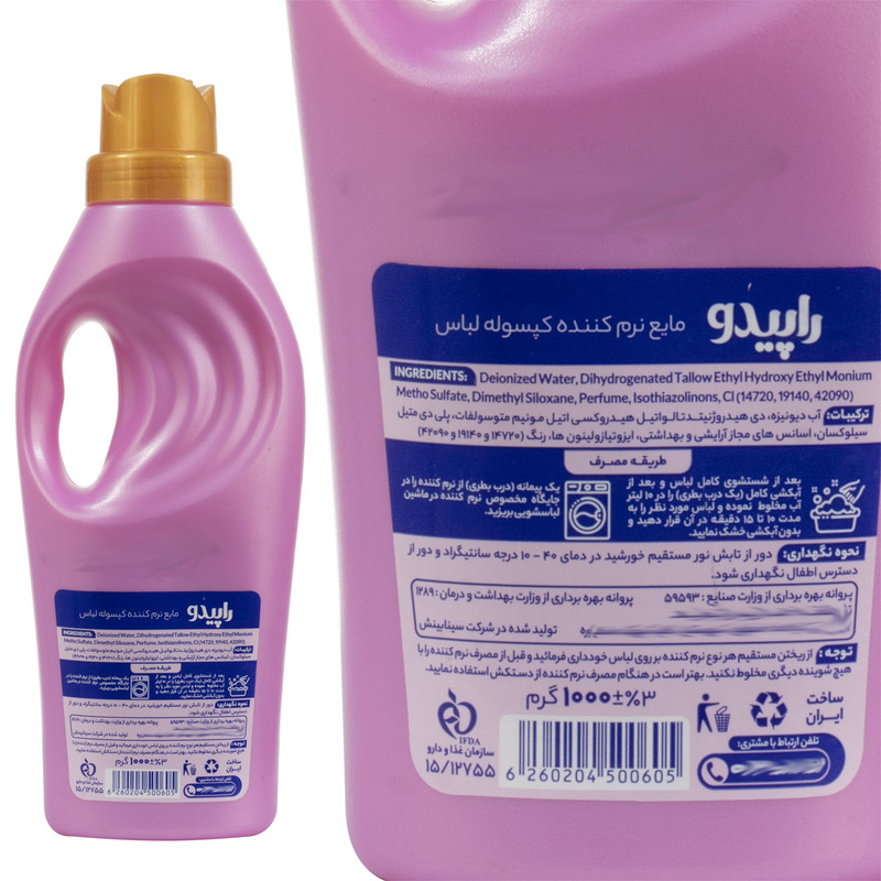 نرم کننده حوله و لباس راپیدو تولید شده در حجم 1 لیتر مناسب برای انواع لباس میباشد. جهت استفاده از این محصول قبل از اخرین آبکشی یک پیمانه از محصول را به آب اضافه کنید و لباس ها را در آن به مدت نیم ساعت بخیسانید و سپس آبکشی نمایید. به هیچ وجه نرم کننده را مستقیما روی پارچه نریزید و قبل از خیساندن پارچه نرم کننده را در آب حل کنید و همچنین با دیگر شوینده ها مخلوط نشود. این محصول باعث لطافت و نرمی الیاف پارچه الکتریسیته ساکن شده و آن ها را از بین می برد. نرم کننده راپیدو اتوکشی راحت تری را برای شما به ارمغان آورده و حاوی اسانس های کپسوله ای دارای رایحه خوشبو بوده که هنگام اتو کشی رایحه ای خوش را درون لباس شما باز کرده و مانگار میکند. این محصول باعث خشک شدن سریعتر لباس میشود.