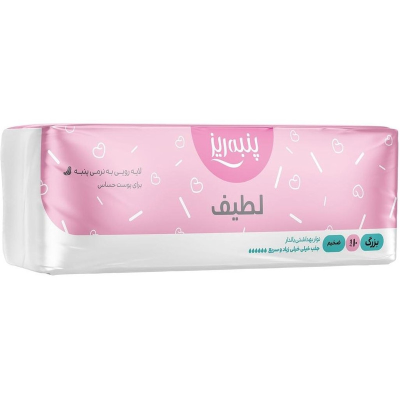 در نوار بهداشتی سایز بزرگ پنبه ریز از الیاف نسبتا نرم استفاده شده است تا در مقایسه با تولیدات بیکیفیت ، احتمال ایجاد حساسیت در پوست را کاهش دهد . ضخامت نوار بهداشتی پنبه ریز زیاد است و قدرت جذب فوقالعادهای دارد. قدرت جذب نوار بهداشتی سافت پنبه ریز 6 از 6 قطره است.