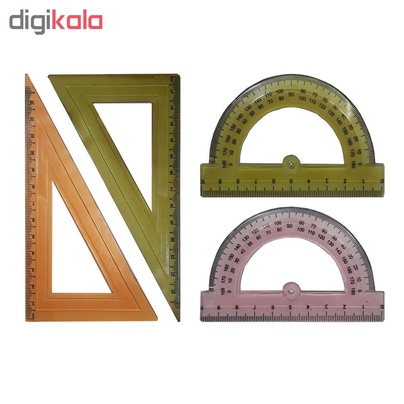 مجموعه 4 عددی شامل 2 عدد نقاله و 2 عدد گونیا جنس محصول : ژله ای انعطاف پذیر رنگ گونیا:سبز کم رنگ و نارنجی رنگ نقاله ها : سبز کم رنگ و صورتی قطر نقاله : 10 سانتی متر ابعاد گونیا : 15*7 سانتی متر
