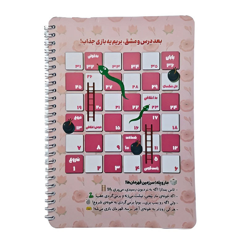 دفتر 50 برگ سیمی طراحی دخترانه و بسیار جذاب هست این دفتر در جلد پشت خود دارای یک صحفه منچ هست که دانش آموز در زمان استراحت می تواند با دوستان خود یک سرگرمی جذاب را تجربه کند.