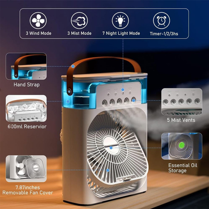 سایر مشخصات : دارای 5 نازل بخور سرد - دارای چراغ خواب RGB - دارای تایمر 3 حالته - 3 حالت میزان باددهی - دارای مخزن خوشبو کننده هوا - دارای مخزن آب 600 میلی لیتر برای افزودن آب یخ