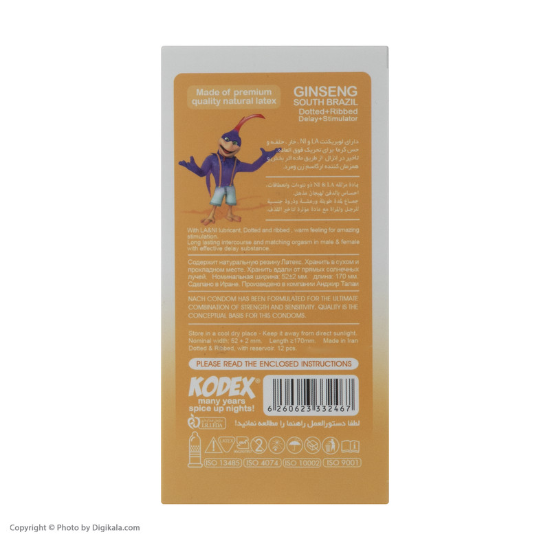 • برای ایجاد اطمینان و جلوگیری از انتقال بیماریهای مقاربتی، از کاندوم تاخیری جینسینگ کدکس مدل Ginseng بسته 12 عددی قبل از ایجاد هرگونه تماس استفاده کنید.