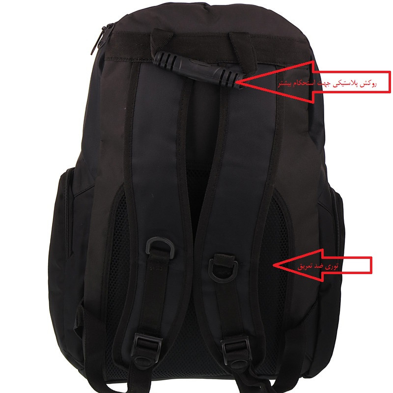 دارای 2 جیب در کنار، یک جیب در پایین و یک جیب در بالای کوله پشتی که زیپی است و با محاسبه محفظه اصلی درکل 5 جیب دارد.