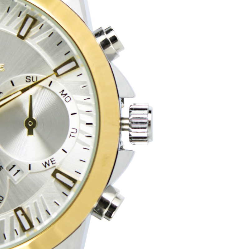 صفحه ی ساعت این برند دارای شیشه با سختی بالا می باشد، همچنین قلب تپنده ی آن یعنی موتور ساعت، از نوع کوارتز است. به دلیل اقتصادی بودن این ساعت فقط موتور اصلی و تقویم آن کار میکند و سه موتور بقیه نمایشی هستند . این ساعت به شکل دایره طراحی شده است که دارای قطر 42 میلی متر و بی نهایت ظریف است .