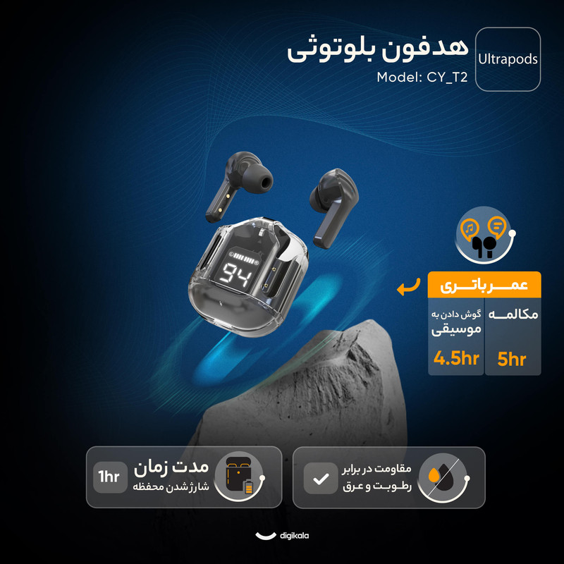 اگر به هدفونهایی که ظاهر جذابی دارند علاقهمند هستید و دوست دارید مدرن بودن آنها به چشم بیاید، هدفون بلوتوثی مدل Ultrapods CY_T2یک انتخاب مناسب خواهد بود. با طراحی مدرن و وزن سبک، برای موارد مختلف استفاده، از شنیدن موسیقی گرفته تا برقراری تماسهای تلفنی، گزینه کارآمدی خواهد بود. این هدفون در دسته تو گوشی (Earbud) قرار میگیرد و با اتصال بیسیم، آزادی عمل بیشتری را به کاربران خود خواهد داد. قطر درایور 8 میلیمتری Ultrapods CY_T2، صدایی شفاف و متعادل را به گوش شما میرساند. این هدفون محدوده پاسخ فرکانسی بین 100 هرتز تا 10 کیلوهرتز را پوشش میدهد که برای کاربری عمومی کاملاً مناسب است. باتری داخلی هدفون با ظرفیت 30 میلیآمپر ساعت امکان پخش موسیقی یا مکالمه را تا 5 ساعت فراهم میکند. همچنین، محفظه شارژ با ظرفیت 300 میلیآمپر ساعت، انرژی لازم برای چند بار شارژ کامل هدفونها را تأمین میکند. طراحی ارگونومیک این هدفون باعث میشود که بهراحتی در گوش قرار بگیرد. نشانگر LED تعبیه شده روی هدفون و محفظه شارژ، وضعیت باتری و اتصال را نمایش میدهد. همچنین، این مدل در برابر رطوبت و عرق مقاوم است و برای فعالیتهای روزمره و ورزشهای سبک ایدهآل به نظر میرسد. اتصال این هدفون از طریق بلوتوث و درگاه USB Type-C انجام میشود که سرعت و راحتی در استفاده را تضمین میکند. زمان مورد نیاز برای شارژ هدفون تنها یک ساعت است و محفظه شارژ نیز در دو ساعت به طور کامل شارژ میشود. Ultrapods CY_T2 با امکاناتی نظیر وزن سبک، صدای شفاف، و مقاومت در برابر رطوبت، انتخابی مناسب برای کاربری روزمره و فعالیتهای عمومی است.