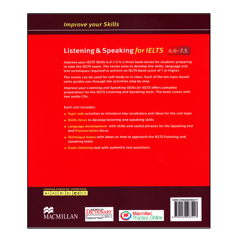 Listening and Speaking for IELTS نام کتابی است از سری کتاب های Improve You Skills که توسط انتشارات MACMILAN به منظور استفاده خودآموز چاپ شده تا شما را برای نمرهی 6 تا 7.5 در مهارت های Speaking و Listening آزمون آیلتس آماده می سازد. این کتاب 121 صفحه ای به 10 موضوع مهم و رایج در بخش های شنیداری و گفتاری طبقه بندی شده است که در هر کدام شامل Topic Talk, Listening Skills, Speaking Skills, Pronunciation, Exam Listening میشوند. این کتاب دارای نکات و تمرین های متنوعی از آزمون آیلتس است که در پایان کتاب پاسخ های آن آمده است. همچنین برای بخش Listening فایل های صوتی به همراه Transcript متن آن نیز آورده شده است.