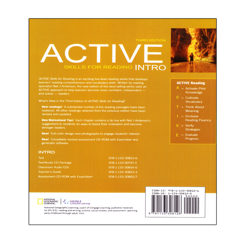 مجموعه Active Skills for Reading کاری مشترک از کمپانی CENGAGE و National Geographic مطابق با سیستم آمریکایی همراه با فایل صوتی در ۱۲ درس موضوعی برای تقویت مهارت reading و گسترش دایره واژگان در ۵ سطح (Intro, 1, 2, 3, 4) ارائه می شود. هر درس شامل Motivational Tips جهت افزایش انگیزه و تقویت مهارت خواندن و critical thinking به منظور تشویق زبان آموزان جهت آنالیز متن می باشد. مجموعه حاضر از روشی پویا و فعال (Active) برای تقویت مهارت reading بهره می جوید. از ویژگی های بارز این مجموعه فعال کردن و تقویت دانش زبانی زبان آموز (Activate Prior Knowledge)، پرداختن به مقوله واژگان (Cultivate Vocabulary)، تفکر درباره معانی (Think about Meaning)، تسلط بیشتر در مهارت reading (Increase Reading Fluency)، بهره گیری از استراتژی های مختلف (Verify Strategies) مانند predicting، scanning و skimming و ارزیابی میزان پیشرفت زبان آموز (Evaluate Progress) می باشد.