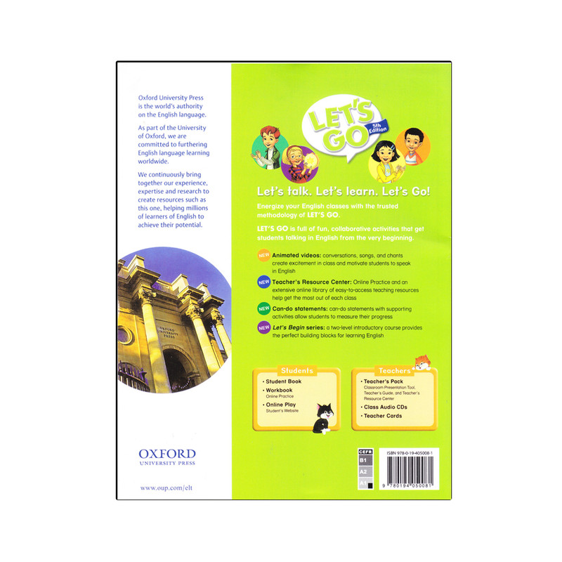 کتاب هاي اين مجموعه در 7 سطح (Let’s Begin, Let’s go 1,2,3,4,5,6) مطابق با سيستم آمريکايي همراه با فايل صوتي و کتاب کار در مراحل اوليه با ارائه نکاتي جهت تقويت مهارت گفتاري و شنيداري، روند پرسش و پاسخ همراه با آهنگ، شعر و بازي به آموزش تلفظ صحيح و روان خواني متون و تست مطابق با استانداردهاي آموزشي کمبريج به شکل لوح فشرده و در سطوح بالاتر جهت تقويت مهارت هاي چهارگانه ارائه مي شود.