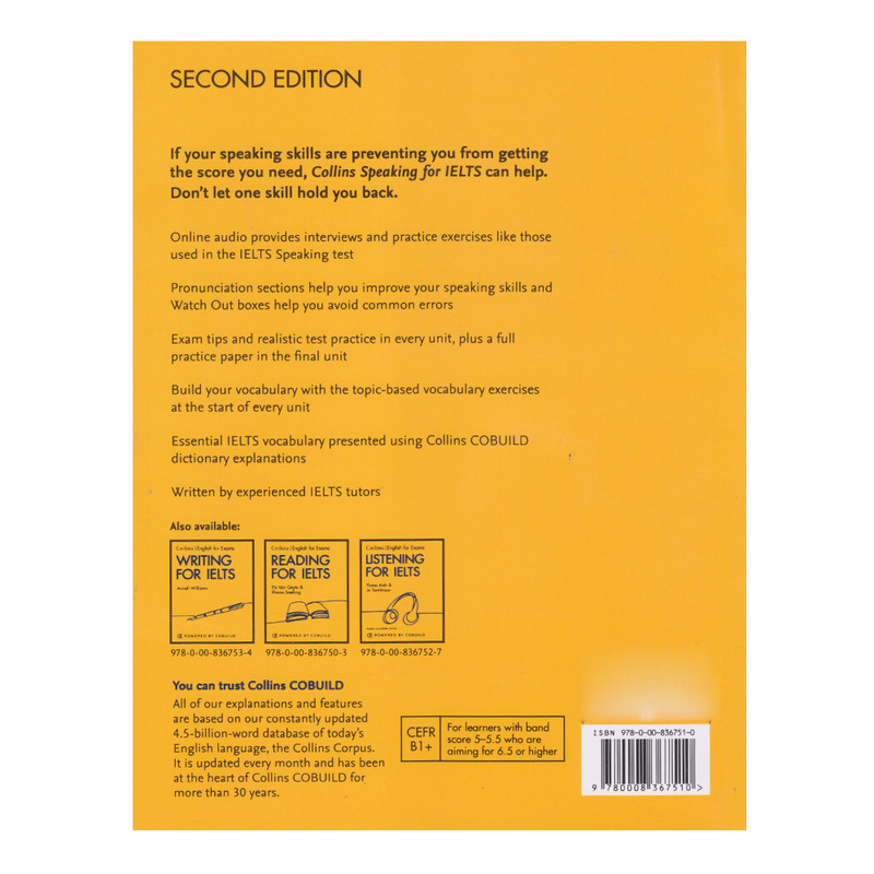 کتاب Collins Speaking for IELTS 2nd Edition ویرایش جدیدی از کتاب Collins English for Exams Speaking for Ielts است که حالا با صفحات تمام رنگی و پاسخنامهای جامع با توضیحات تکمیلی به دانشآموزان عرضه میشود. کتاب حاضر که در 12 فصل، موضوعات و انواع سوالاتی که دانشآموزان ممکن است در آزمون آیلتس با آن مواجه شوند را پوشش میدهد، با دربرداشتن نکات ریزی که مرز موفقیت یا عدم موفقیت در آیلتس هستند، کتابی بسیار مفید و بهتر از نسخه قبلی خود است. کادرهای Watch out که به کتاب افزوده شدند، تذکری درباره اشتباهات رایج در آزمون گفتاری آیلتس ارایه میدهند. با تمرین و مطالعه این کتاب در کلاس یا به صورت خودخوان، دانشآموزانی با سطح B1 میتوانند که نمره کل خود را از 5 به 6 و بالاتر از آن برسانند.