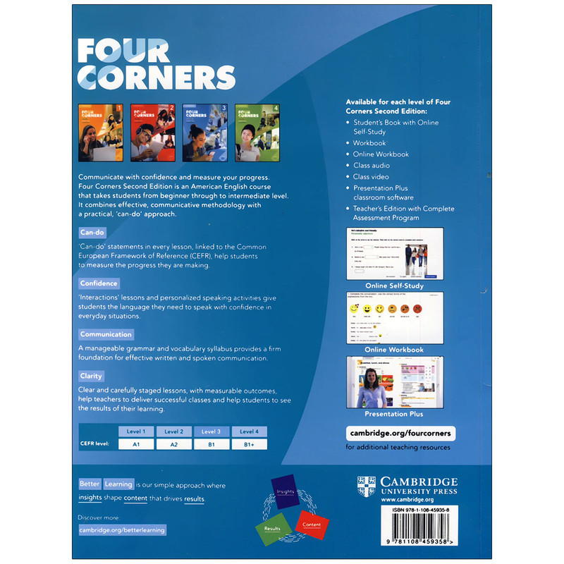 کتاب Four Corners مطابق با سیستم آمریکایی بوده و امروزه یکی از پرطرفدارترین کتاب های آموزشی در سرتاسر جهان است. این کتاب بر چهار مهارت اصلی به میزان مساوی متمرکز بوده و مناسب آن دسته از افرادی است که طالب یادگیری زبان انگلیسی در زمان کوتاه و به بهترین نحو ممکن می باشند. هر بخش از کتاب شامل ارائه واژگان جدید، دستورزبان کاربردی و خوانش های مناسب با انها می باشد. همانطور که گفته شد کتاب حاضر در صدد آن است تا با ارائه دروسی جامع و هدفمند مهارت های چهارگانه را بی کم و کاست پوشش داده و آموزشی پویا و جذاب را فراهم آورد.