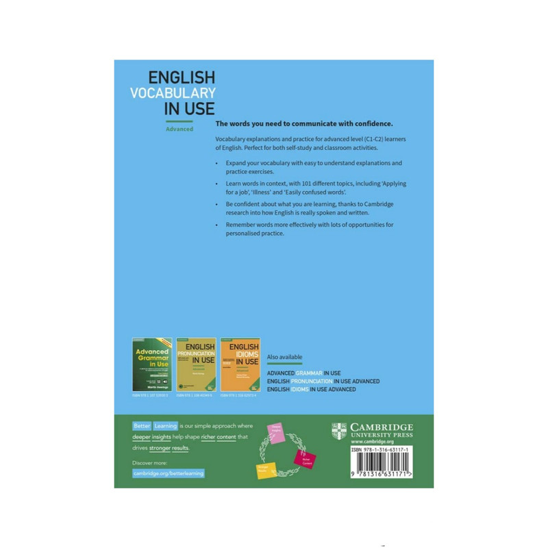 سري کتاب هاي Vocabulary in Use، منتشر شده از سوي انتشارت کمبريج، مجموعه اي کامل براي آموزش لغات انگليسي مي باشد. سري امريکن اين کتاب شامل سه سطح مقدماتي تا پيشرفته با نام هاي (Basic- Intermediate- High intermediate) است. ( دوستاني که به دنبال تقويت لغاتشان بر اساس لهجه بريتيش هستند مي توانند از سري بريتيش اين کتاب شامل سطح هاي Elementary, Pre-intermediate ,intermediate, Upper intermediate, Advance استفاده کنند). هر درس اين مجموعه در دوصفحه طراحي شده است که صفحه نخست آن به معرفي لغت جديد و معني آن بصورت تصويري يا دادن تعريفي از آن مي پردازد و بلافاصله لغت را در جمله اي به کاربرده است و در صفحه مقابل تمرين هايي براي ارزيابي ميزان يادگيري لغات آورده است. از مزاياي اين مجموعه مي توان به موضوع بندي لغات (topic based) اشاره کرد. مزيت ديگر اين کتاب نشان دادن کاربرد صحيح لغات تدريس شده در بافت مي باشد که بدين وسيله يادگيري لغت را در ذهن نهادينه مي کند و به زبان آموز الگويي براي کاربرد لغات مي دهد. مهم ترين مزيت اين مجموعه پاسخ نامه اي است که در انتهاي کتاب آمده است که اين کتاب را براي عزيزاني که قصد دارند زبان را بصورت خودخوان بياموزند قابل استفاده مي کند.