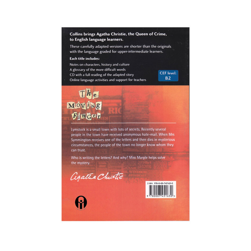 کتاب Collins English Readers The Moving Finger اثر Agatha Christie رمان جنایی شامل داستان یک خواهر و برادر که به یک روستای آرام نقل مکان میکنند. در آنجا پیغامهای تهدید آمیزی برای افراد روستا ارسال میشود و سرانجام یک خانم خودکشی میکند. اما خانم مارپل که در آن زمان در روستا، در خانه دوستش بود، فکر نمیکند که آن خانم خودکشی کرده باشد. کمی بعد خدمتکار خانه آن خانم نیز به قتل میرسد. خانم مارپل با کمک خواهر و برادر تازهوارد و دختر زن کشته شده، قاتل را پیدا میکند.