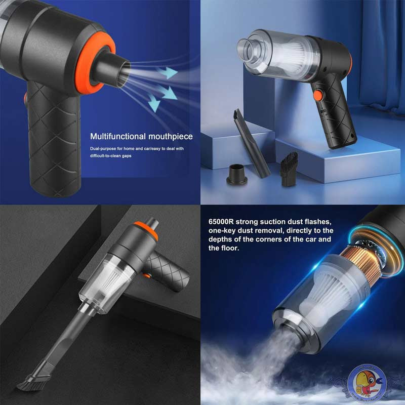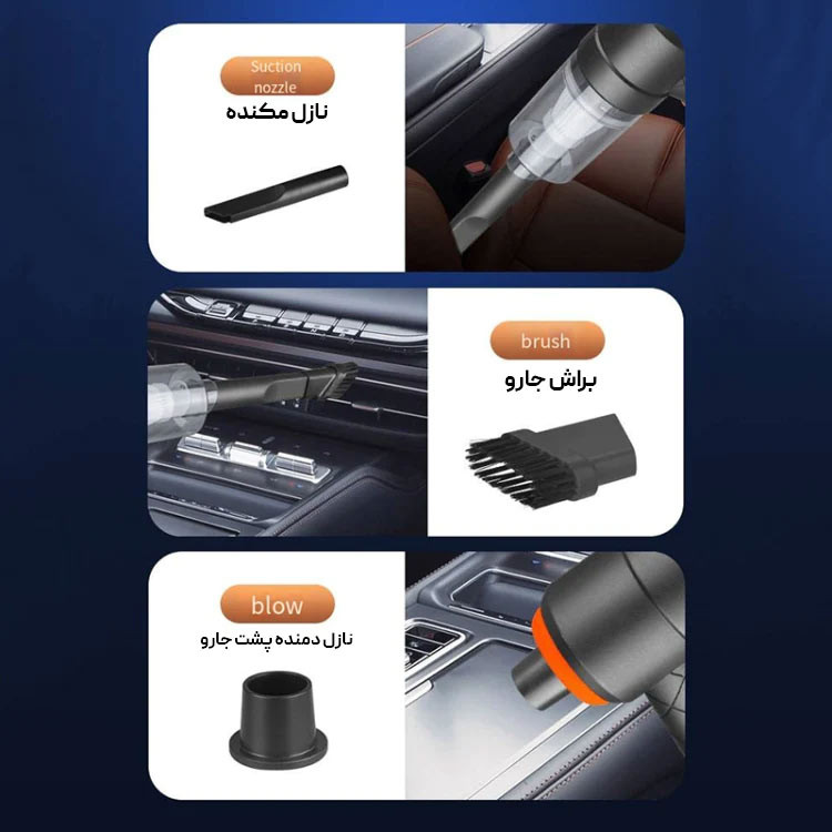 اگر به دنبال یک جارو شارژی برای خودرو و ماشین تان هستید این پیشنهاد عالی را به شما می دهیم، محصولی بی نظیر و با قدرت فوق العاده تولید کشور چین که دارای مخزن با گنجایش عالی و مکش بالا برای تمیز کردن سریع داخل ماشین کاربرد دارد.این جارو دو قابلیت مکندگی و دمندگی دارد این جارو شارژی ماشین قابل حمل دارای دو سری می باشد که به قسمت مکنده متصل می شود که یکی برای قسمت هایی مانند بین صندلی که دسترسی به آن سخت است طراحی شده و سری دیگر دارای فرچه برای گردگیری از موکت زیر پا و بیرون کشیدن خاک و مو طراحی شده است که بسیار کاربردی می باشد. برای شارژ کردن این دستگاه می توانید سری USB را به شارژر موبایل یا شارژر فندکی ماشین وصل کنید و سر دیگر آن را به دستگاه متصل کنید تا شارژ کامل شود و از آن تا ساعت ها استفاده کنید. جاروبرقی چند منظوره – این جاروبرقی قابل حمل نه تنها عملکرد جاروبرقی را دارد، بلکه عملکرد گرد و غبار و دمنده هوا را نیز دارد. هنگام استفاده از عملکرد خلاء، لوازم جانبی مختلفی برای پاسخگویی به نیازهای سناریوهای مختلف وجود دارد. با قرار دادن نازل هوا در پشت جاروبرقی، می توان آن را به بادگیر و دمنده برای تمام نظافت و نیازهای روزانه شما تبدیل کرد. جاروبرقی کارآمد – طراحی بی سیم و قدرت مکش 6000 پاسکال به شما این امکان را می دهد که گرد و غبار، موهای حیوانات خانگی، شن و ماسه، باقیمانده غذا، مقدار کمی مایع و چیزهای مختلف پنهان شده در کوسن ها یا مبل ها را در هر زمان و هر مکان به راحتی تمیز کنید. باتری لیتیومی داخلی 1200 میلی آمپر می تواند نیاز شما را پاسخگو باشد. لوازم جانبی کاربردی فوق العاده – علاوه بر لوازم جانبی مختلف نازل هوا، این جاروبرقی اتومبیل علاوه بر این شامل فیلتر ضد گرد و غبار و یک میله طولی برای دسترسی به قسمت های تنگ بین صندلی ها می باشد. بی سیم و قابل حمل – این جارو شارژی دستی کمتر از 300 گرم وزن دارد. طراحی بی سیم به شما امکان می دهد بدون محدودیت از آن استفاده کنید. زندگی را راحت تر کنید جاروبرقی سایز کوچک برای انواع سناریوها مانند خانه، محل کار و ماشین مناسب است. هنگام استفاده، نویز کمتر از 70 دسی بل است که باعث ایجاد مشکل در صدا نمی شود.