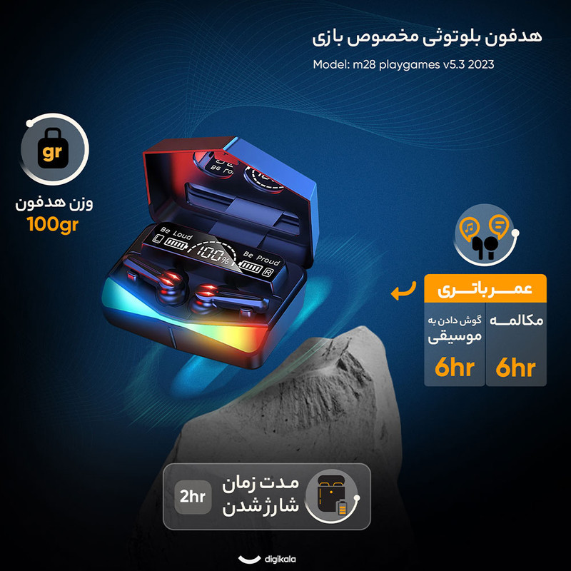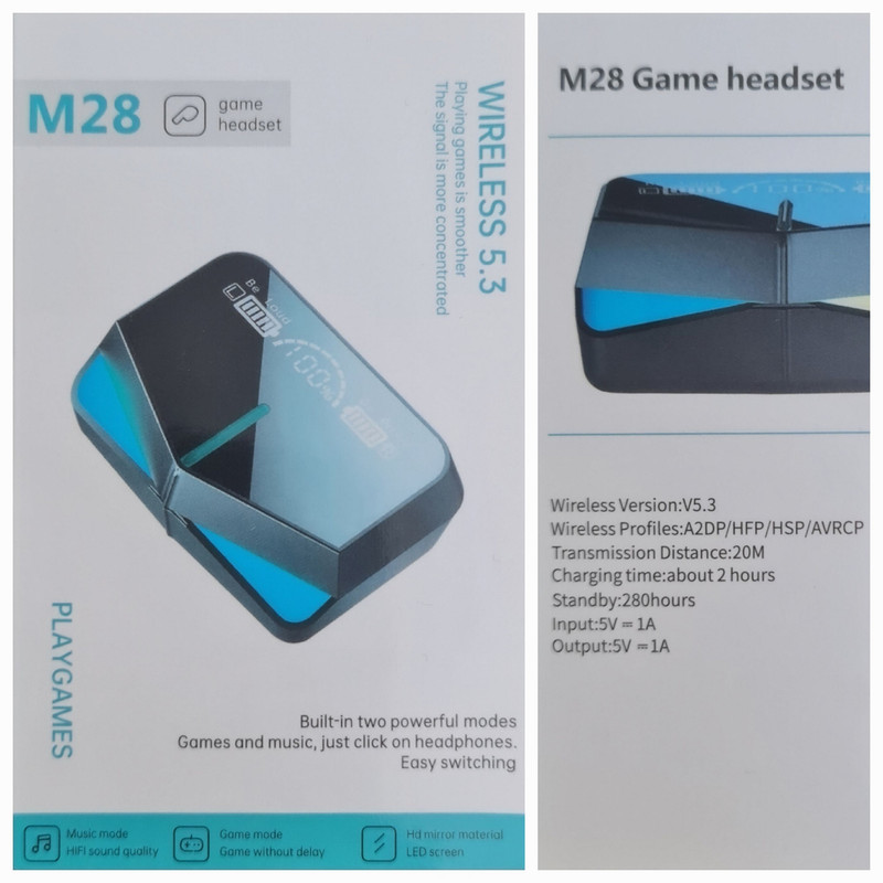 امروزه انواع هدفون با انواع کاربری تولید میشوند. مدل M28 یک هدفون بلوتوثی مخصوص گیم بوده که از کیفیت صدا و میکروفون خوبی بهره میبرد. معمولا مشکل کاربران در هنگام استفاده از هدفونها شارژ کم هدفون در هنگام استفاده بوده که این امر باعث شده تا نیاز به شارژ پیاپی محفظه داشته باشند، اما مدل M28 دارای یک محفظه شارژ به ظرفیت 2000 میلی آمپر ساعت است که توانایی شارژ هدفونها را تا 5 مرتبه داشته و همچنین توانایی شارژ یک گوشی دیگر را نیز دارد. به همین دلیل این هدفون نه تنها شما را از مشکل شارژ پیاپی رها میکند، بلکه میتواند به عنوان یک پاوربانک 2000 میلیآمپری نیز برای شما عمل کرده و گوشی شما رو شارژ کند. طراحی M28 مخصوص گیمرها است و همچنین طراحی نور روی محفظه باعث شده تا جذابیت گیمری خاصی نیز پیدا کند. از دیگر جذابیتهای این محصول چیپست هوشمند آن بوده که ترکیب آن با سنسورهای تاچ هدفون باعث شده تا بتوان به راحتی با دستورات لمس گوشی کل نیازهای کاربر اعم از قطع و وصل مکالمه، کم و زیاد کردن صدا و پلی و استاپ و تعویض موزیک را پاسخ داد. در آخر، طراح محصول برای هر چه بهتر شدن این محصول دو تم گیمینگ و موزیک برای آن در نظر گرفته که با استفاده از دستورات داخل دفترچه راهنمای فارسی میتوانید به راحتی این دو تم را تغییر دهید.