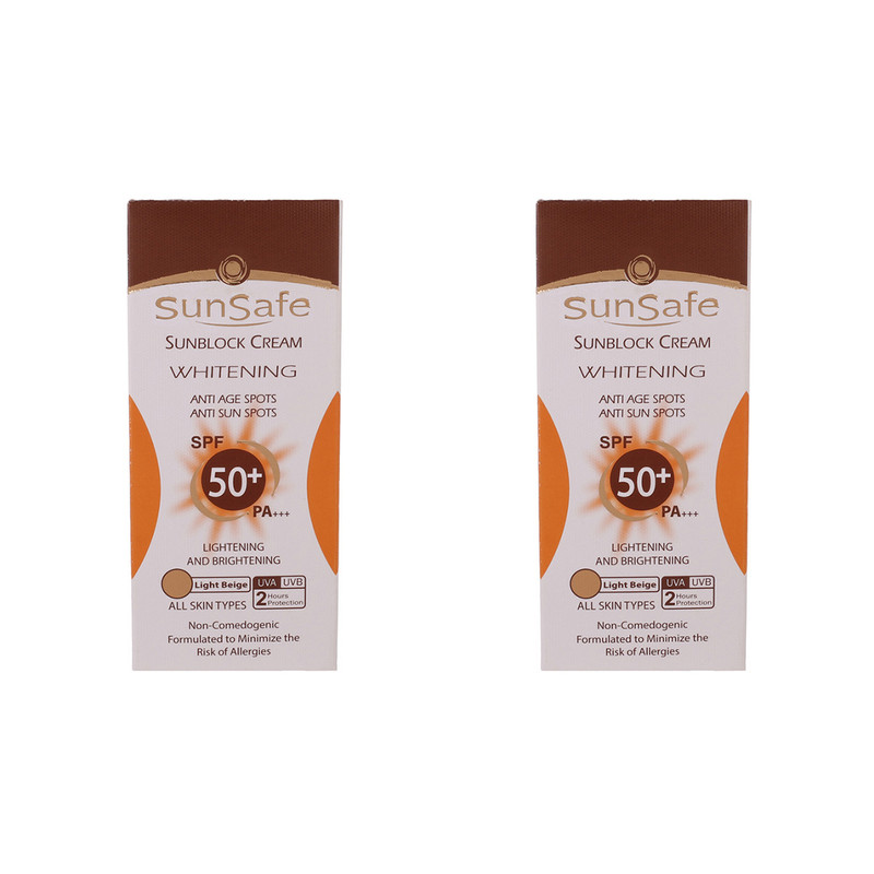 کرم ضد آفتاب رنگی دست و صورت سان سیف SPF 50 مدل روشن کننده و ضد لک ‌محافظ UVA ،UVB، مناسب برای انواع پوست حجم 50 میلی‌لیتر بسته ۲ عددی