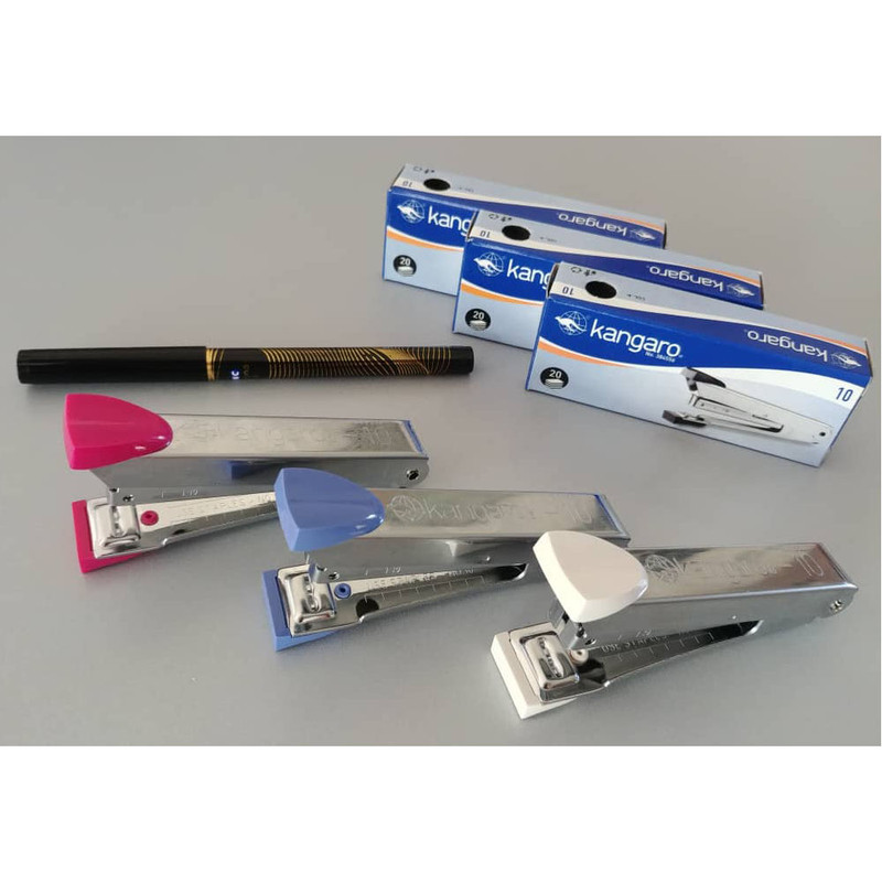 دستگاه منگنه کانگرو مدل No.10 ساخت شرکت با سابقه و مطرح کانگرو هندوستان می باشد، این محصول بدنه ای از جنس فلز دارد که بسیار مقاوم است و دارای ابعاد (95×40×20) میلی متر و وزن 70 گرم می باشد. منگنه کانگرو مدل No. 10 از ظرفیت دوخت 20 برگ کاغذ (80گرمی) برخوردار است و سوزن دوخت شماره 10 در آن قابل استفاده می باشد که در هر بارگیری 50 عدد سوزن درون خود جای می دهد. همچنین عمق ورود کاغذ در این منگنه 52 میلیمتر می باشد. این محصول به صورت دستی عمل می کند و از ابعاد کوچکی برخوردار است که کار با آن را بسیار راحت تر می کند، این منگنه برای کار های روزمره بسیار مناسب می باشد و نسبت به قیمت خود کارایی و کیفیت بالایی دارد.
