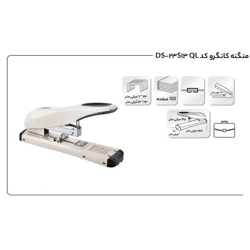 ابعاد255x60x85 میلیلیتروزن570 گرمساختار بدنهفلزحداقل تعداد ورق قابل منگنه شدن1 ورقحداکثر تعداد ورق قابل منگنه شدن100 ورقظرفیت خشاب سوزن100 سوزنسایز سوزن منگنه23/13رنگطوسی