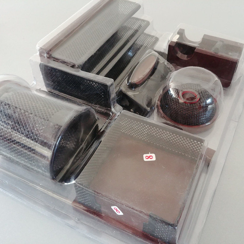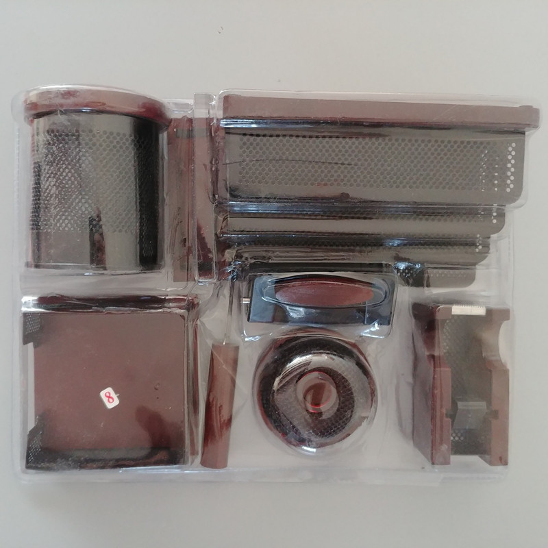 اقلام موجود در بسته شامل: - پایه تقویم رومیزی - جای پاکت نامه - جا کارتی - جاچسبی - جای کاغذ یادداشت - جا سوزنی (گیره) - جامدادی رومیزی - پاکت باز کن