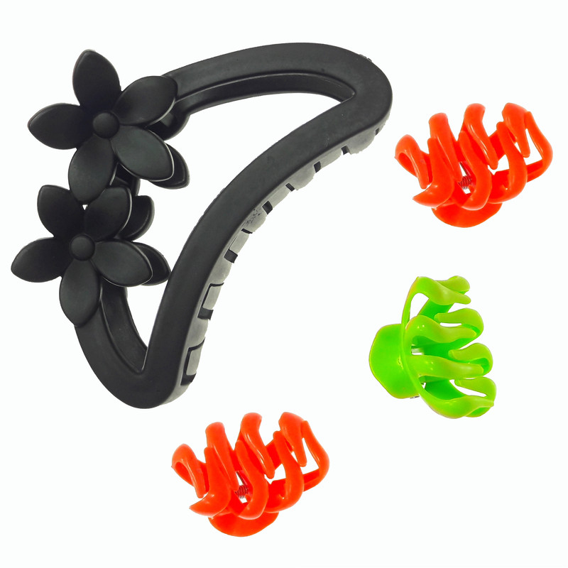 یک عدد کلیپس مشکی با سایز 7x4x4 سانتی متر و 3 عدد کلیپس کوچک با سایز 3.5x2.5x2.5 سانتی متر ( 2 عدد نارنجی و یک عدد سبز ) در مجموع بسته 4 عددی