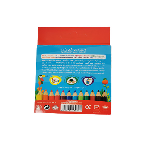 تعداد موجود در بسته12درجه سختی نوکHBجنس جعبهمقواییسایر توضیحاتمداد رنگی 12 رنگ آریا دربسته بندی متنوع سایز کوتاهتعداد رنگهای موجود در بسته12