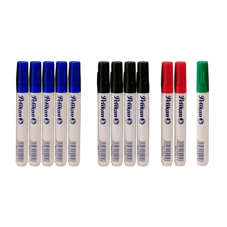 این محصول شامل 5 ماژیک آبی ، 4 ماژیک مشکی ، 2 ماژیک قرمز و 1 ماژیک سبز نوک تخت پلیکان می باشد