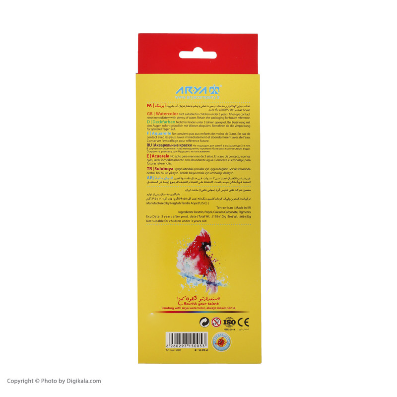 رنگ‌های موجود در بسته : مشکی , آبی , سبز , نارنجی , قرمز , صورتی , قهوه‌ای , زرد