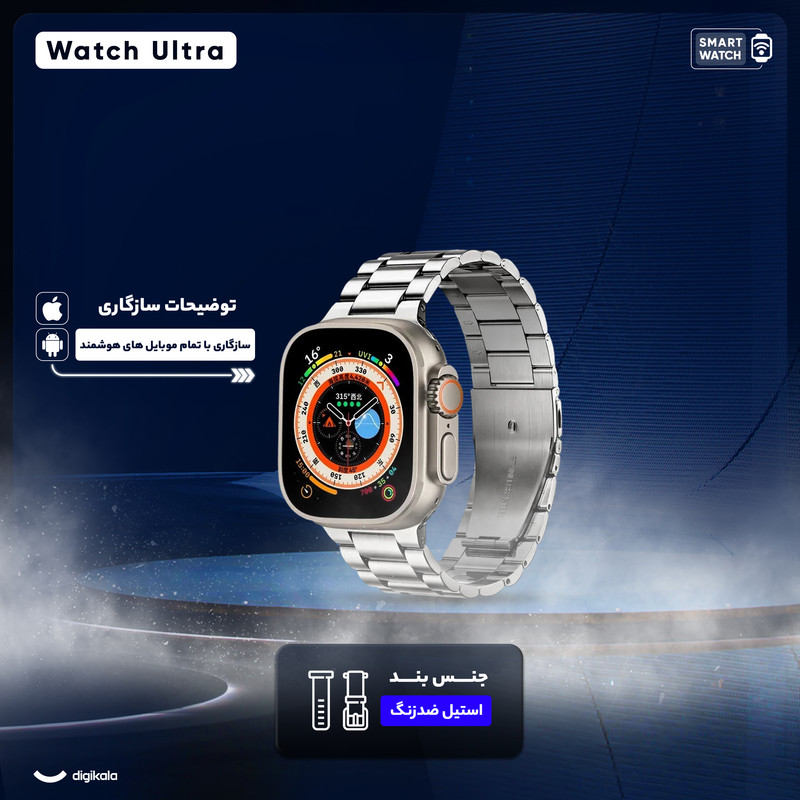 ساعت هوشمند مدل watch ultra دارای قابلیت های صفحه نمایش رنگی، صفحه نمایش لمسی، کنترل موسیقی (Music Player)، کنترل سطح اکسیژن خون، قابلیت مکالمه از طریق بلوتوث بند فلز