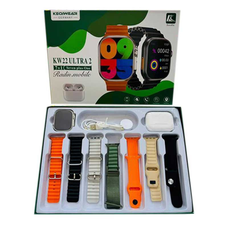ساعت هوشمند مدل KW22 ULTRA به همراه ایرپاد دارای قابلیت های صفحه نمایش رنگی، صفحه نمایش لمسی، کنترل سطح اکسیژن خون، قابلیت مکالمه از طریق بلوتوث، پشتیبانی از زبان فارسی در منو و سیستمعامل بند سیلیکون