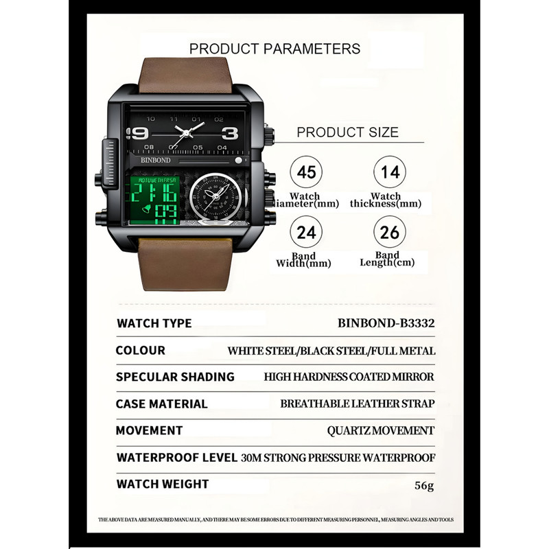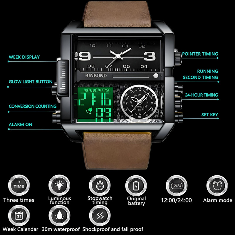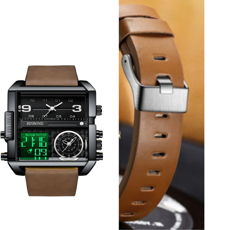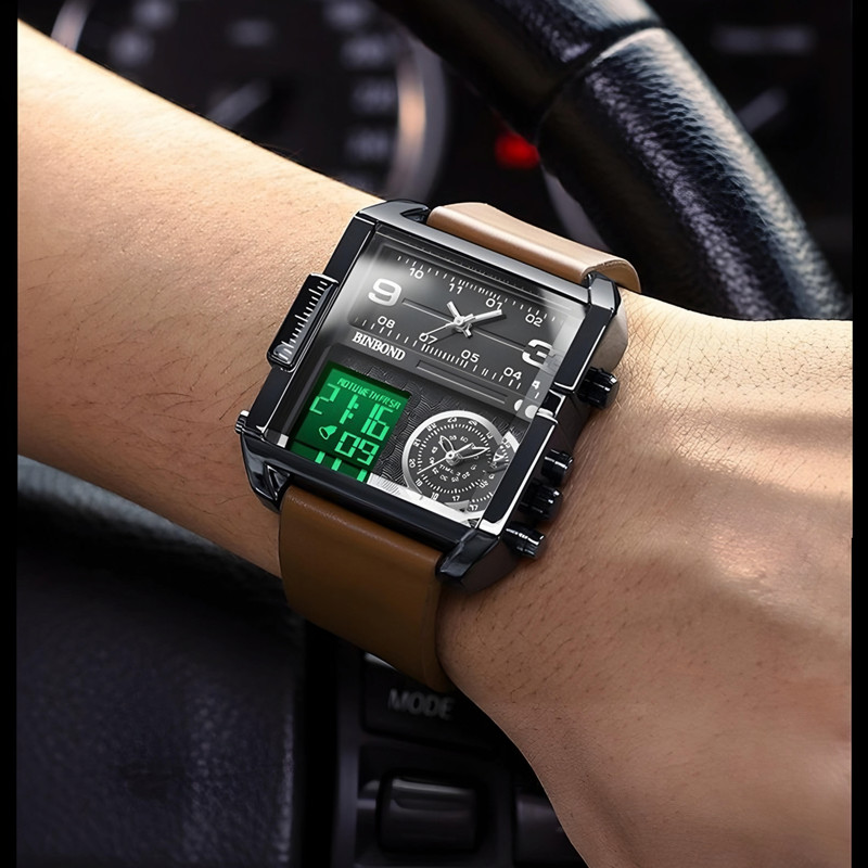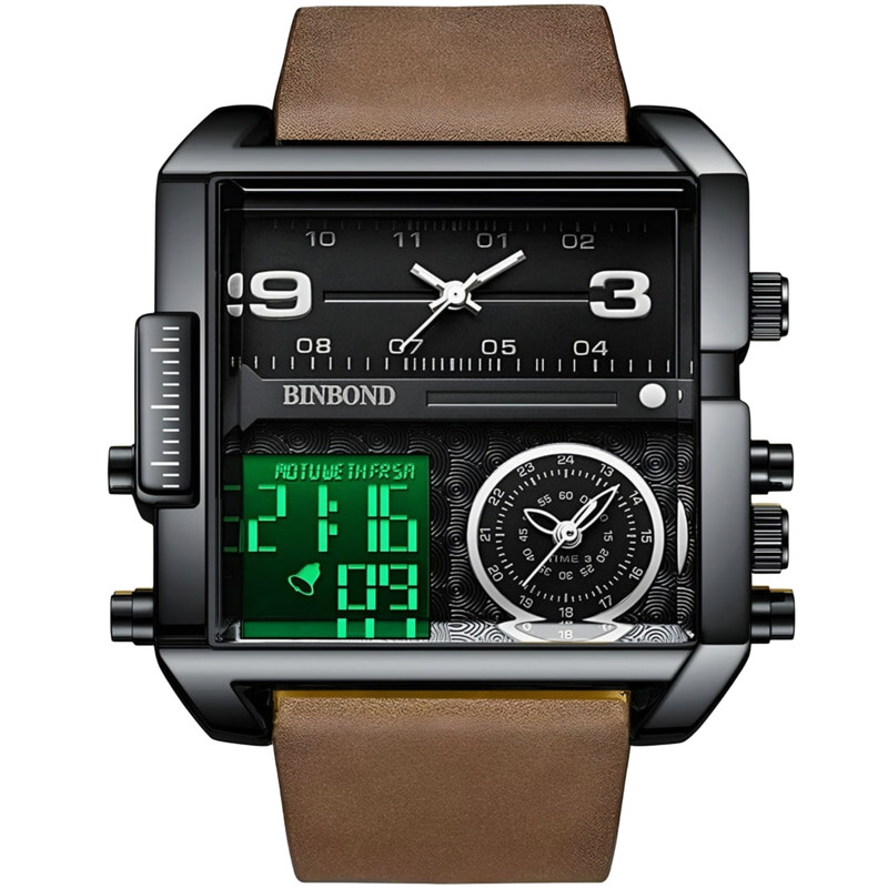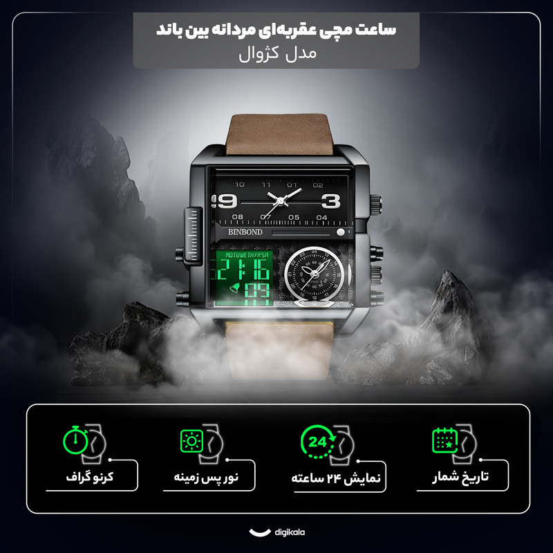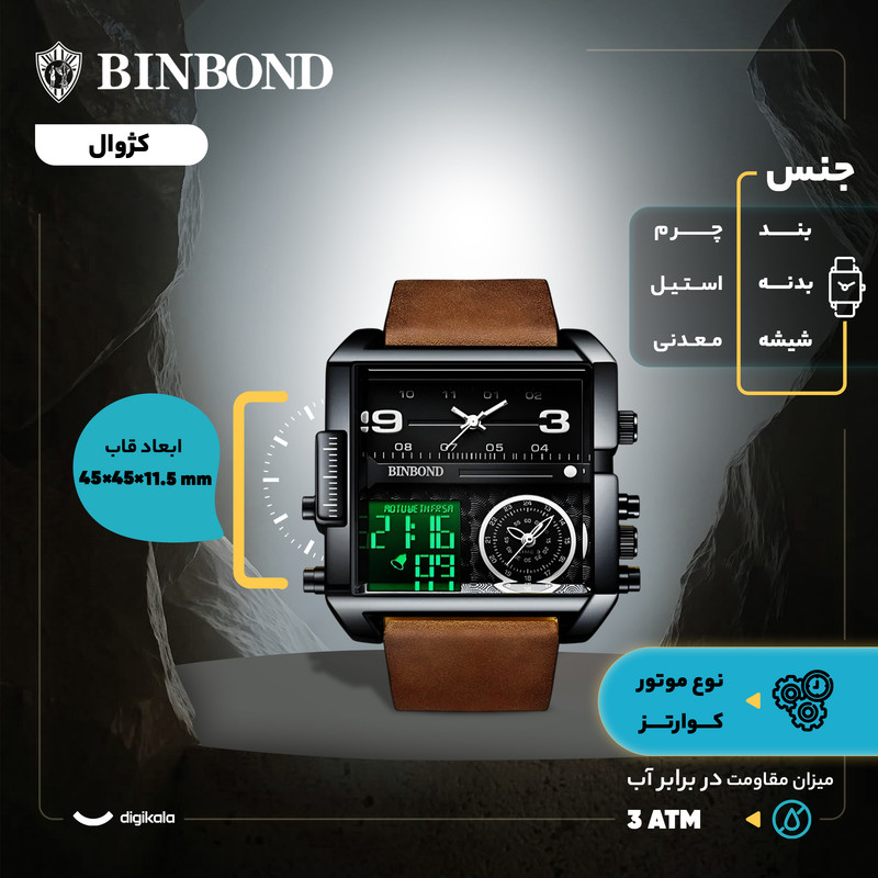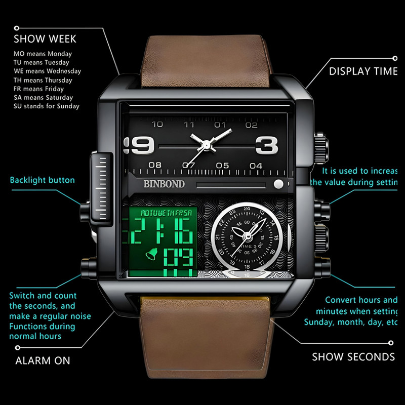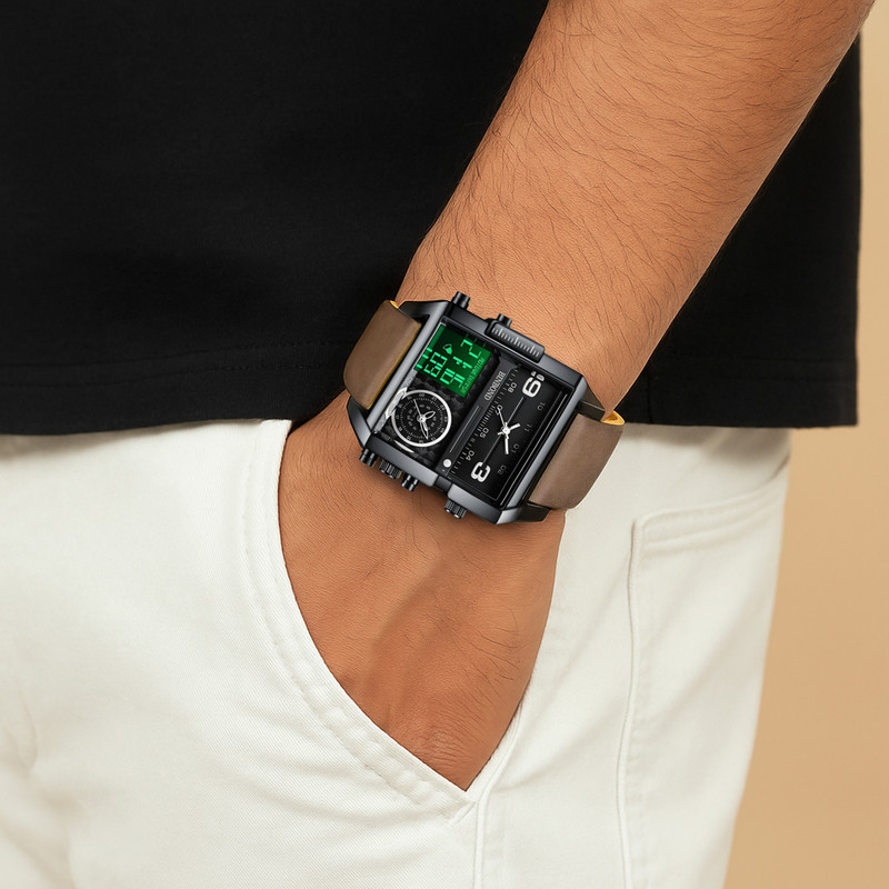 ساعت مچی عقربهای بین باند مدل سه زمانه بند چرم، بیشتر از یک اکسسوری است؛ بدنه مشکی رنگ از جنس استیل مات، ظاهری جذاب دارد که بهراحتی با انواع تیپ و استایلها هماهنگ میشود. بند چرم قهوهای، بهخوبی با بدنه در تضاد قرار گرفته و بهواسطه انعطافپذیری بالا، بهطور کامل با فرم مچ دست تطابق دارد و هیچگونه آزار یا فشاری ایجاد نمیکند. طراحی مربعی صفحه آنالوگ و دیجیتال با پسزمینه مشکی و جزئیات خاص، ساعت را از مدلهای ساده و تکراری موجود در بازار متمایز کرده است. شیشه معدنی مقاوم، زیبایی صفحه را حفظ میکند و در برابر ضربه، خط و خشهای روزمره محافظی قابل اعتماد است. موتور کوارتز دقیق و قدرتمند این ساعت، با منبع انرژی باتری، نیازی به تنظیم مکرر نداشته و از نگرانی بابت توقف ناگهانی جلوگیری میکند. همچنین، مقاومت در برابر آب تا ۳ATM، آن را برای استفاده روزمره و در شرایط آبوهوایی مختلف مناسب میسازد.