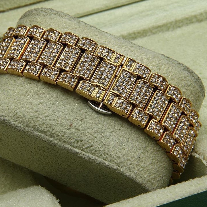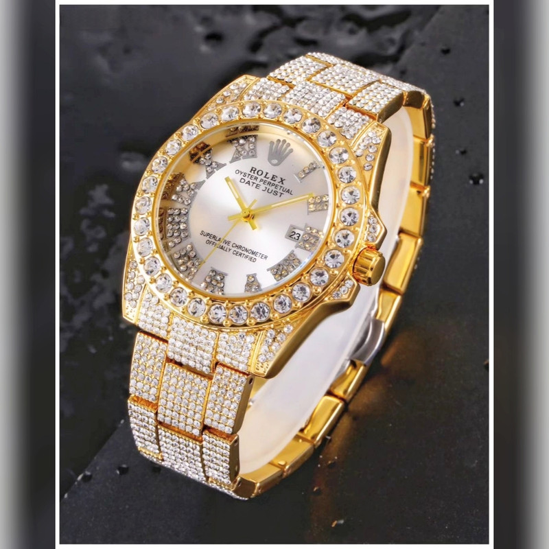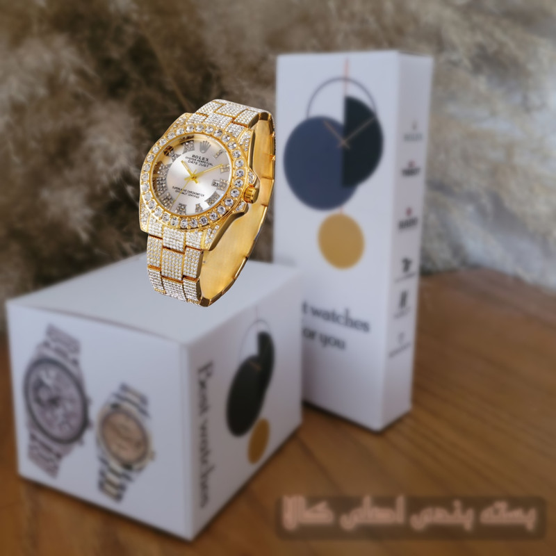 دارای روز شمار رنگ طلایی سیلور قاب نگینی قفل پروانه ای استیل صفحه نگینی بند استیل حروف یونانی تقویم تلسکوپی به همراه جعبه مخصوص و باتری اضافه