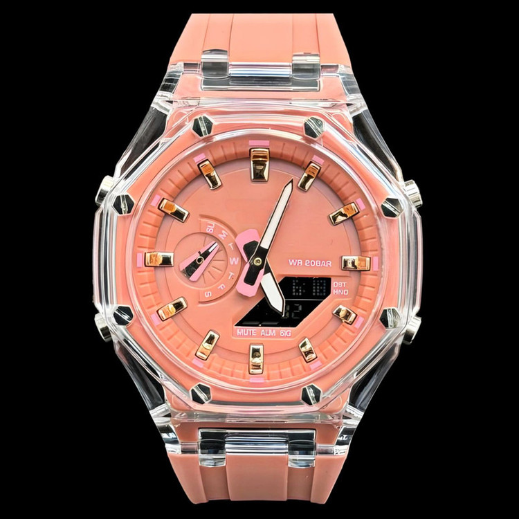 ساعت مچی عقربه ای مدل دو زمانه پمپی قاب شفاف کد golb