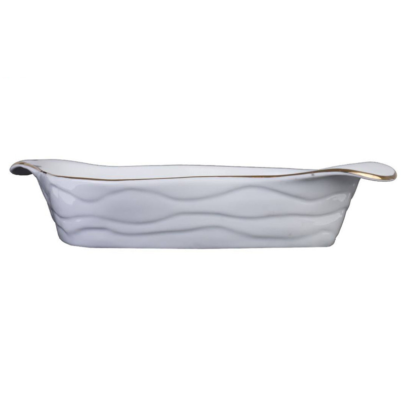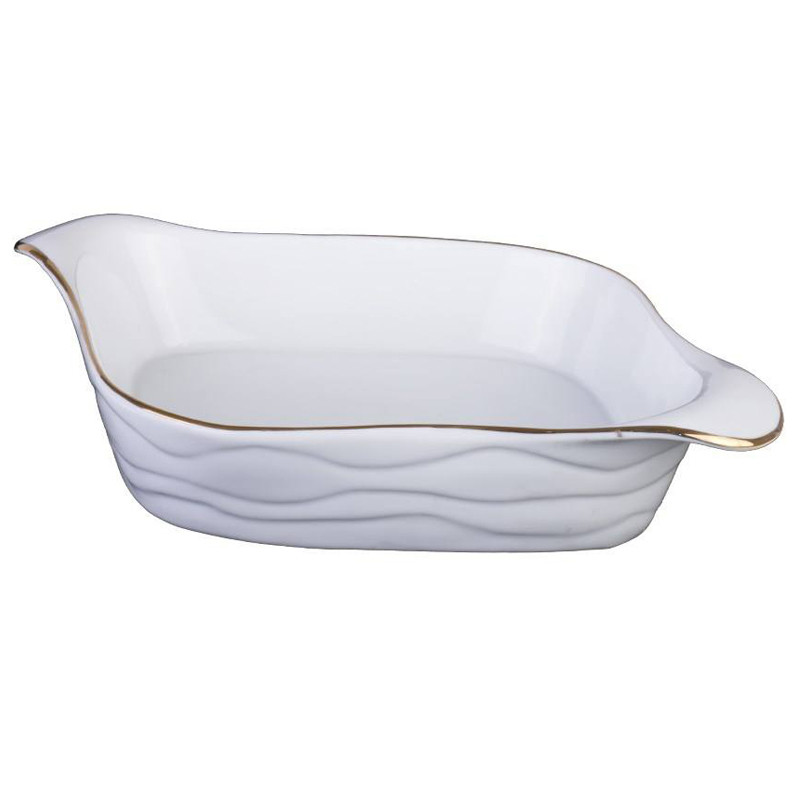 طراحی این ظرف به زیبا ترین و جدیدترین فرم انجام شده است.لبه طلایی ظرف با رنگ سفید بدنه آن حس لوکس بودن و خاص بودن را به استفاده کننده از آن می دهد.ضمن اینکه طرح های موج دار موحود در بدنه ، این ظرف را از حالت یکنواختی و سادگی بیش از حد خارج می کند