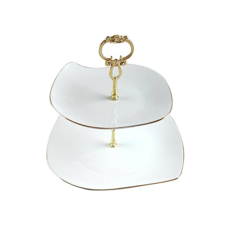 شیرینی خوری دو طبقه مقصود - جنس چینی - دارای دو طبقه - لب طلا - دارای انحنای زیبا - دارای دسته طلایی به شکل گل -ابعاد : طول : 27 - عرض : 19 - ارتفاع : 28 سانتیمتر
